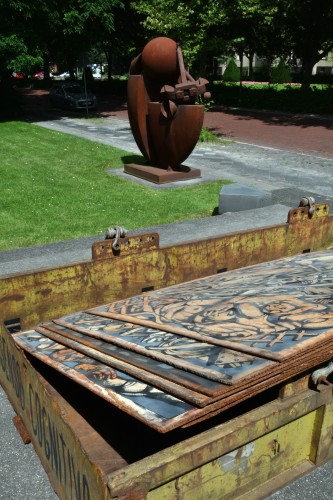 Stahlwanne, Metallplatten, Acrylfarbe, ca. 3 x 2 m